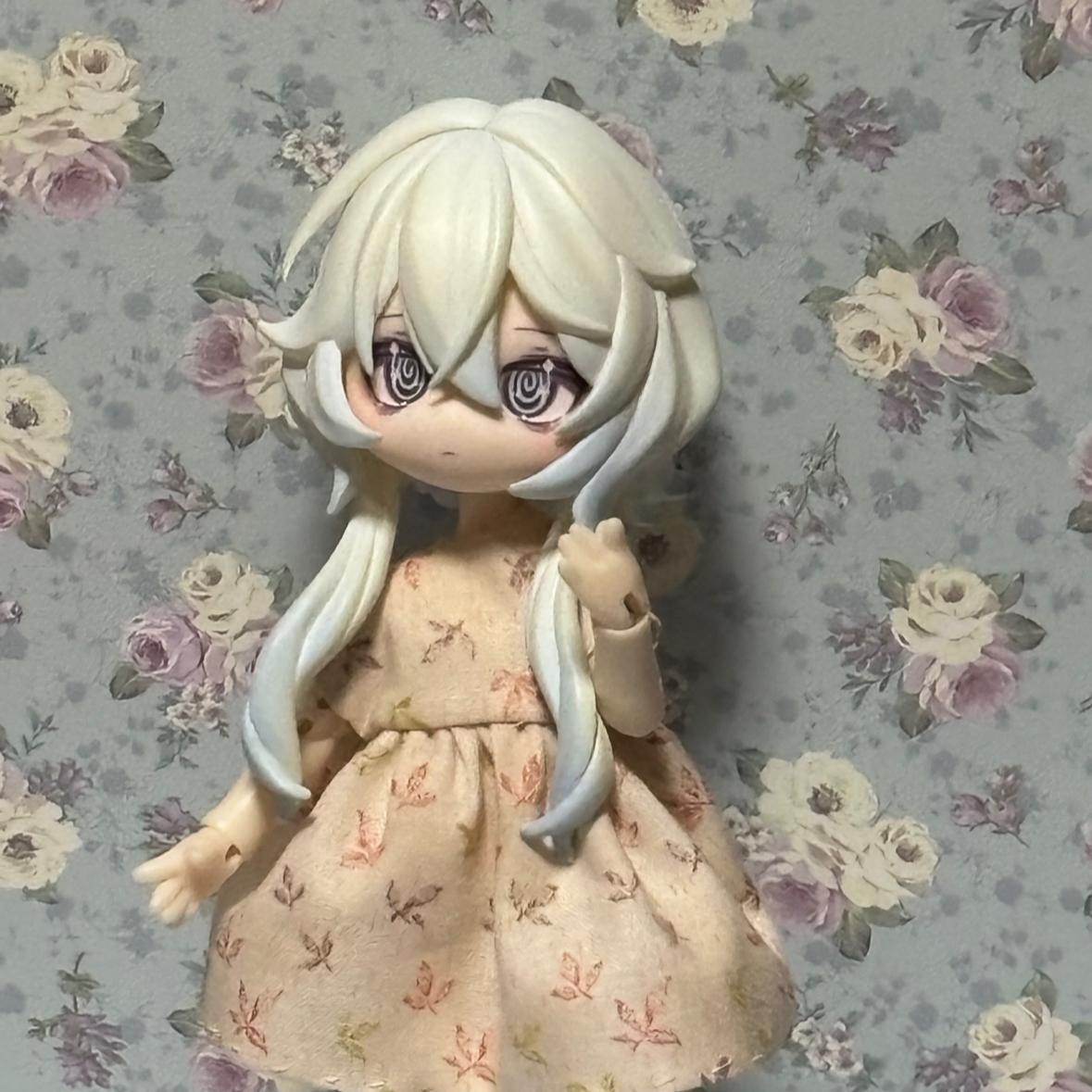 スピカちゃんに新作の落ち葉柄ワンピースを着てもらいました!柔らかな色が似合ってかわいい!
