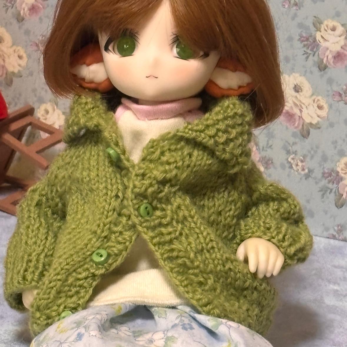 みたまちゃんに新作のグリーンカーディガンを着てもらいました!上着としてもいい感じ!
