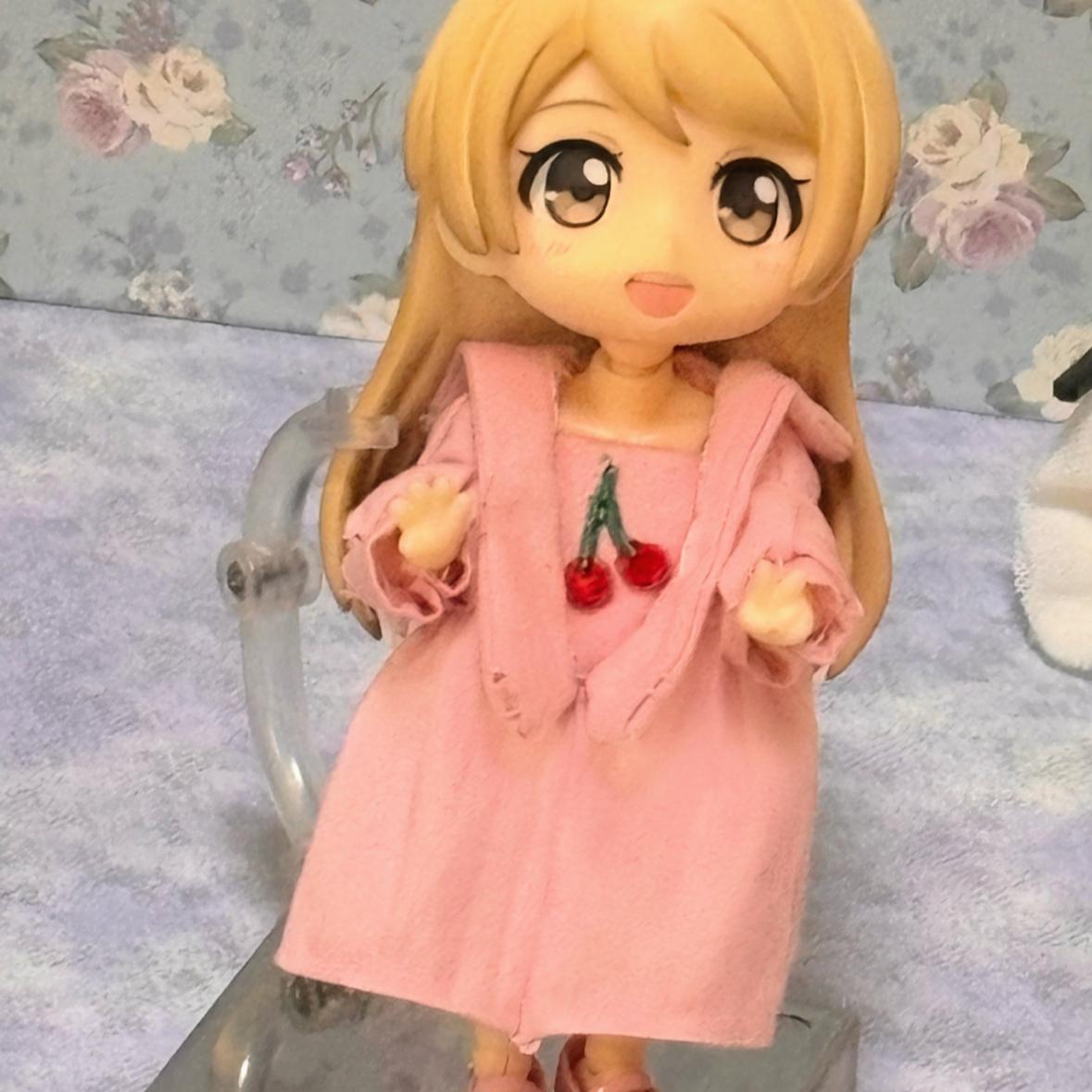 アリスちゃんに新作のピンクワンピースを着てもらいました!胸元のさくらんぼはワッペン!